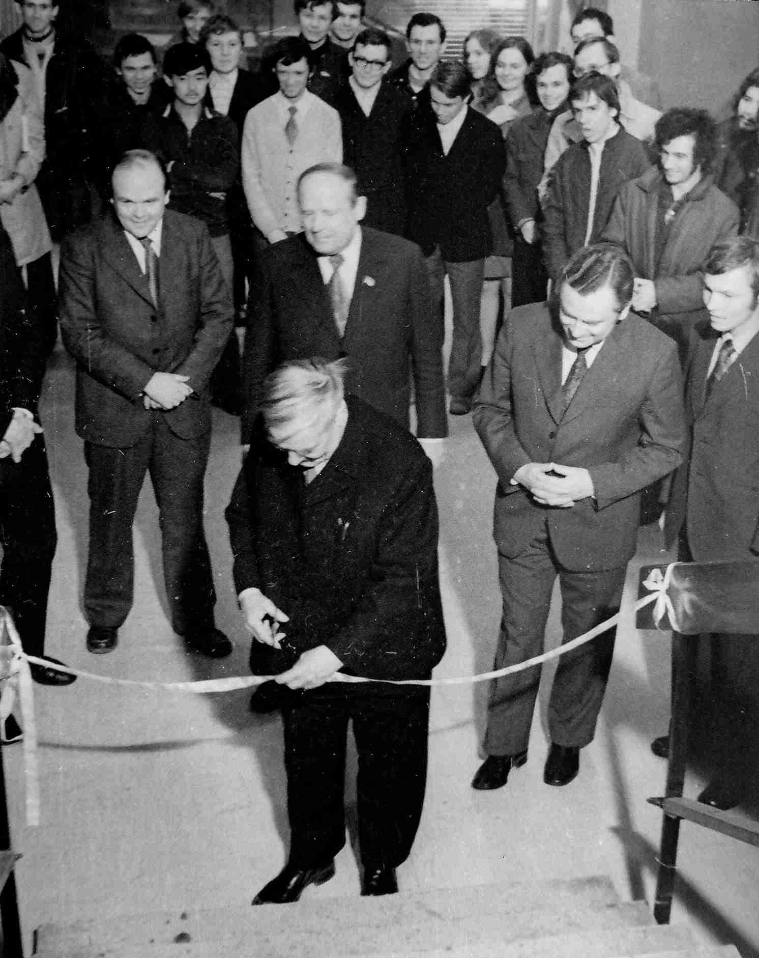Открытие факультета проблем физики и энергетики ФПФЭ, 1976. Академик Роальд Зиннурович Сагдеев и нобелевский лауреат Александр Михайлович Прохоров, декан факультета академик Евгений Павлович Велихов, академики Иван Филиппович Образцов и Олег Михайлович Белоцерковский. Ленту режет академик Петр Леонидович Капица
